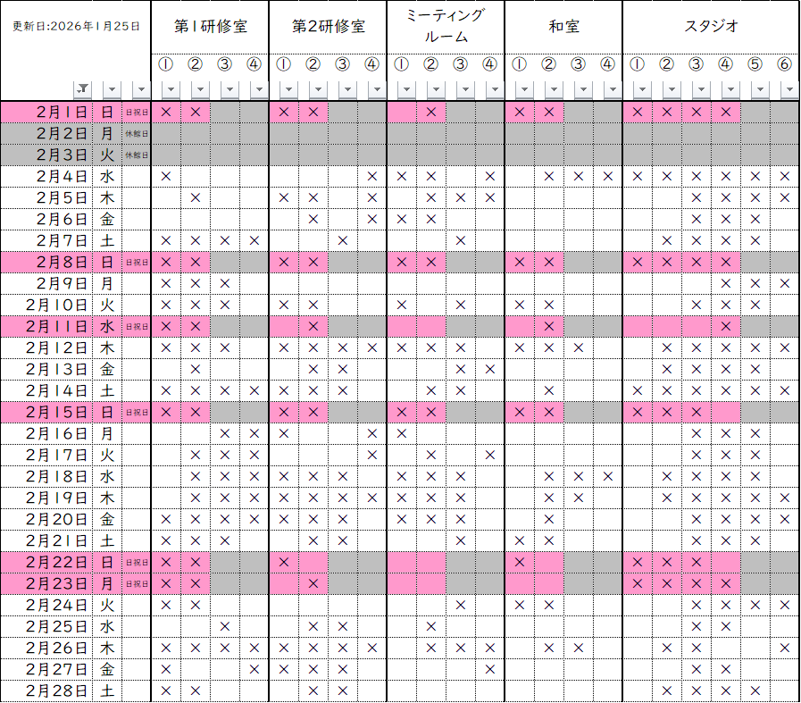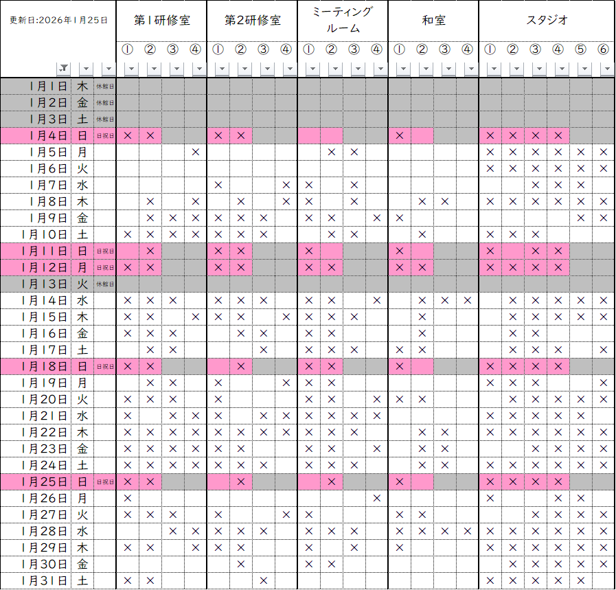 横浜市青少年育成センター全室の、2026年1月~2026年4月までの空き状況をお知らせします。