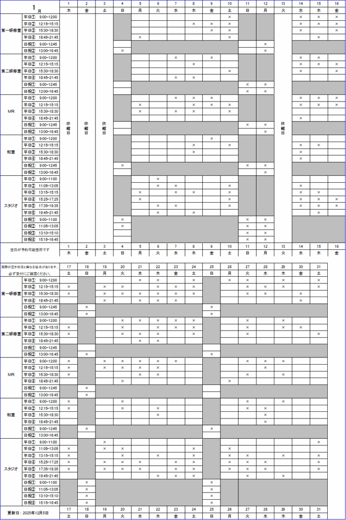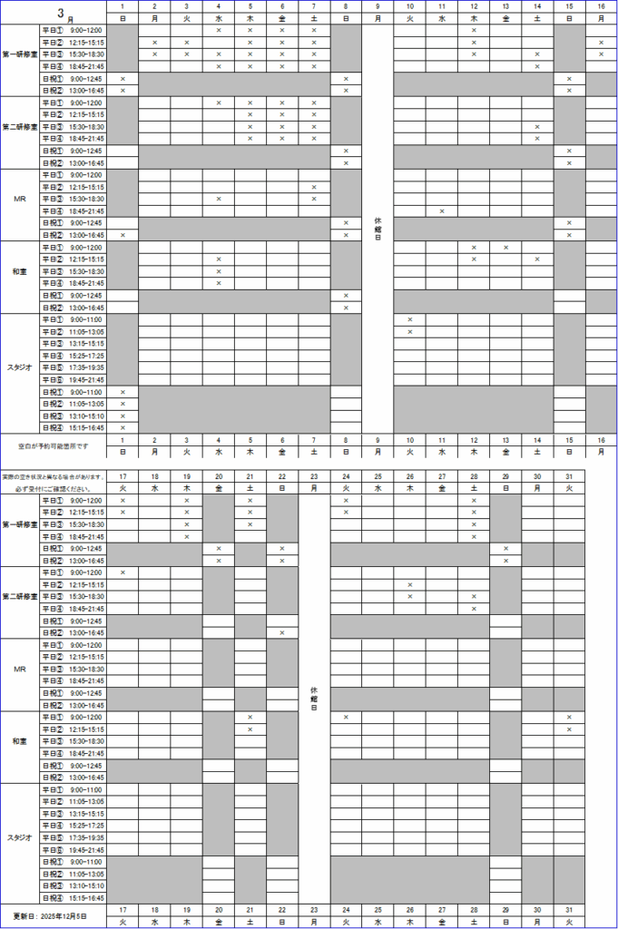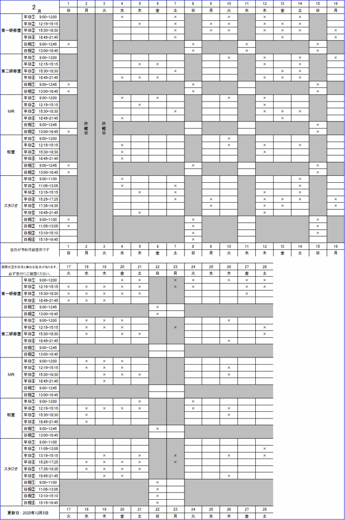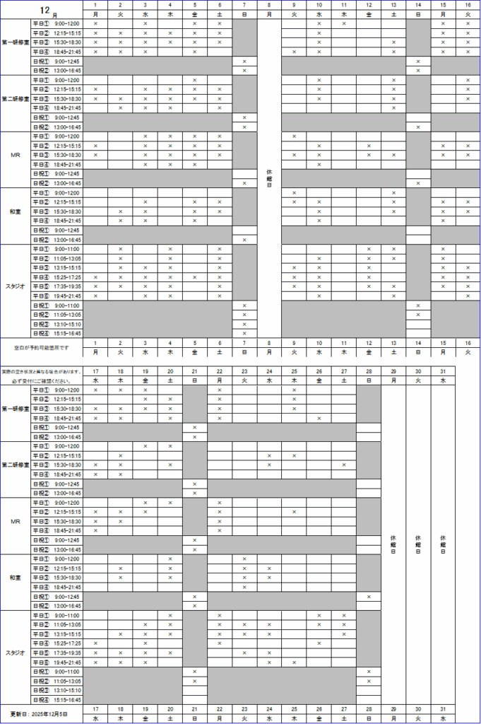 横浜市青少年育成センター全室の、2025年12月~2026年3月までの空き状況をお知らせします。