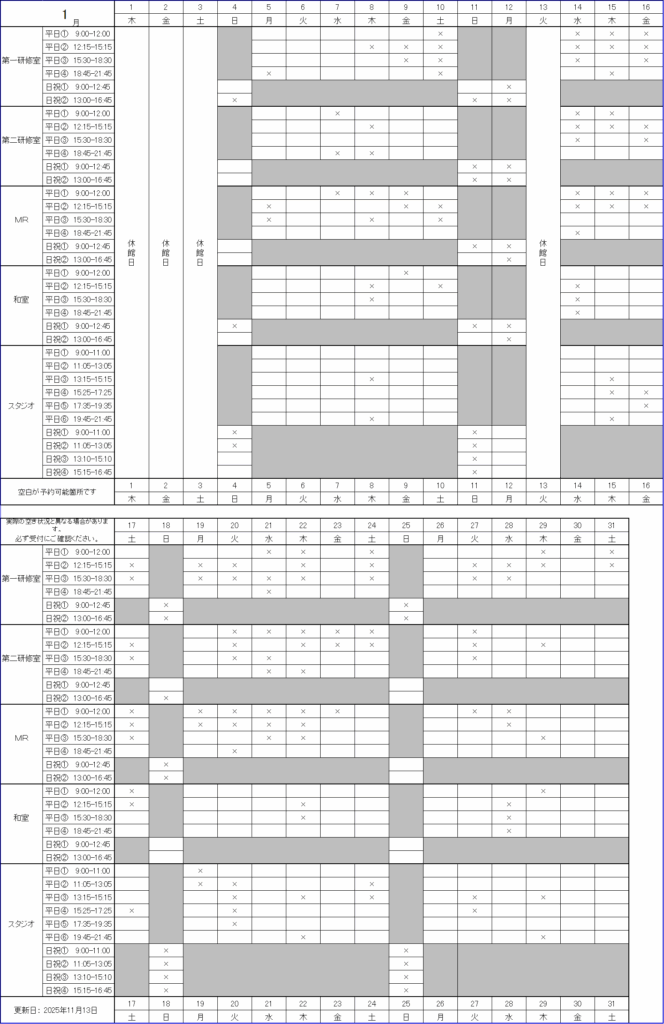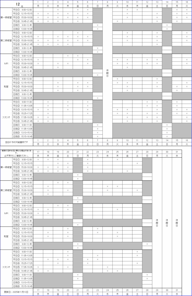 横浜市青少年育成センター全室の、2025年11月~2026年2月までの空き状況をお知らせします。