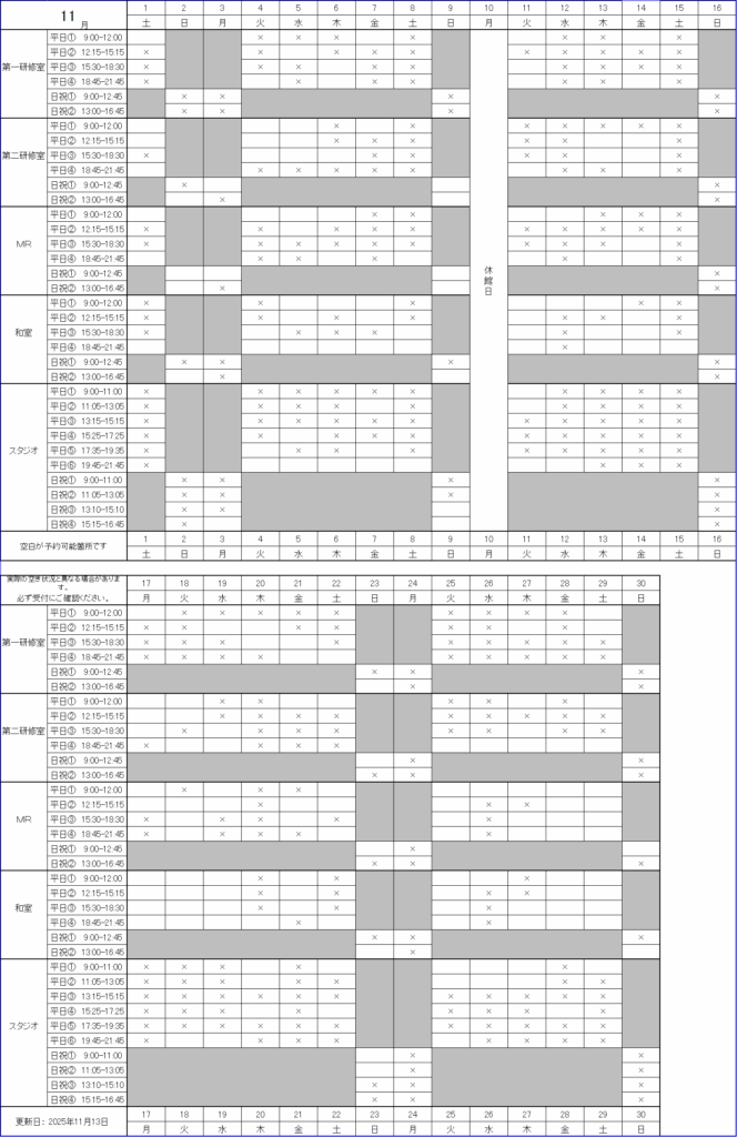 【育成センター】2025年11月~2026年2月分 空き状況(2025/11/13 9:00現在)