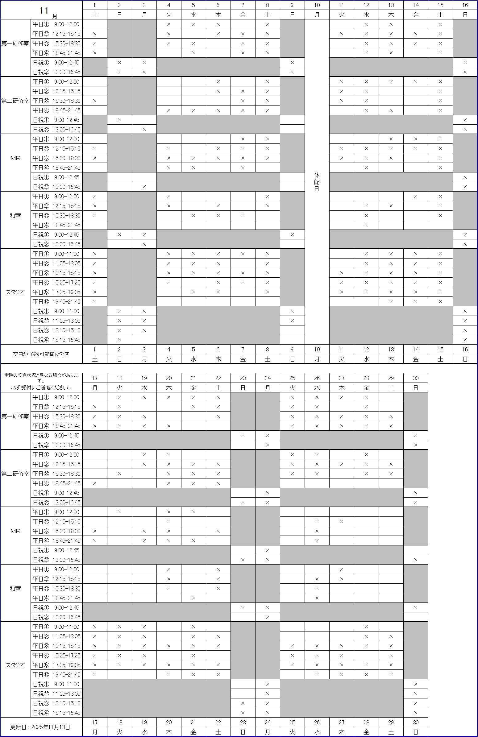 横浜市青少年育成センター全室の、2025年11月~2026年2月までの空き状況をお知らせします。