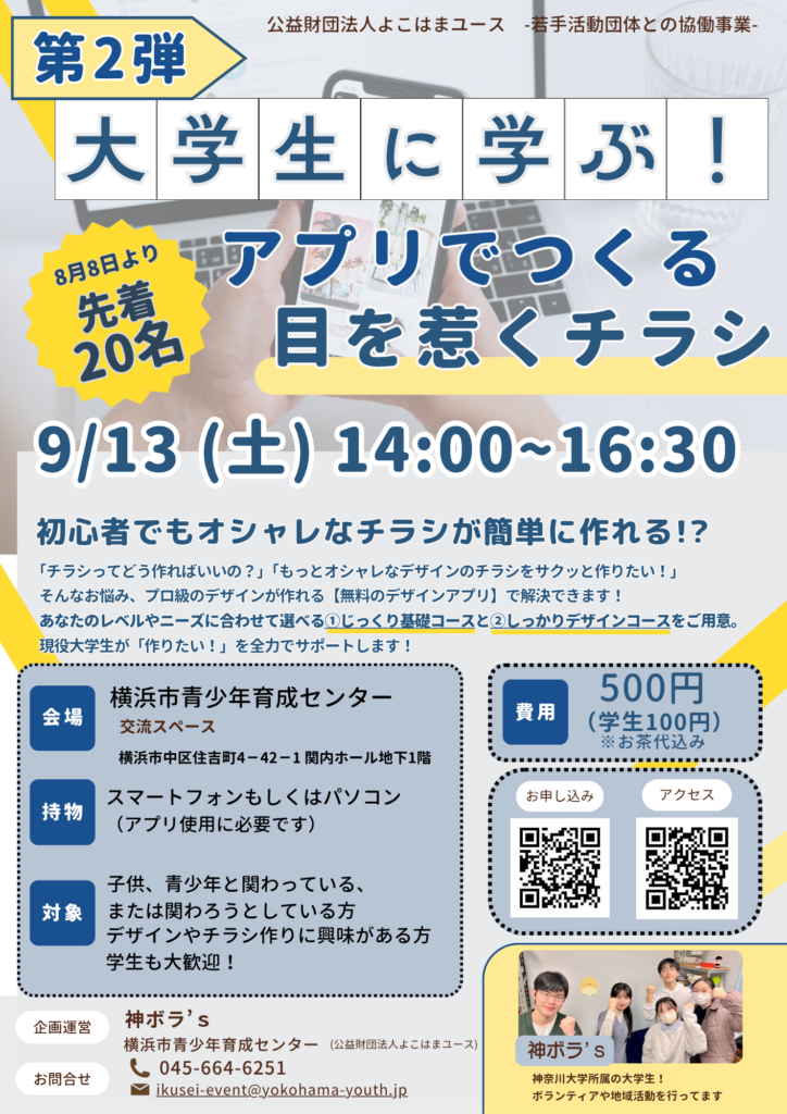 昨年度好評だった、大学生によるアプリを使って、手軽につくれるチラシの作り方講座の第2弾を開催いたします!