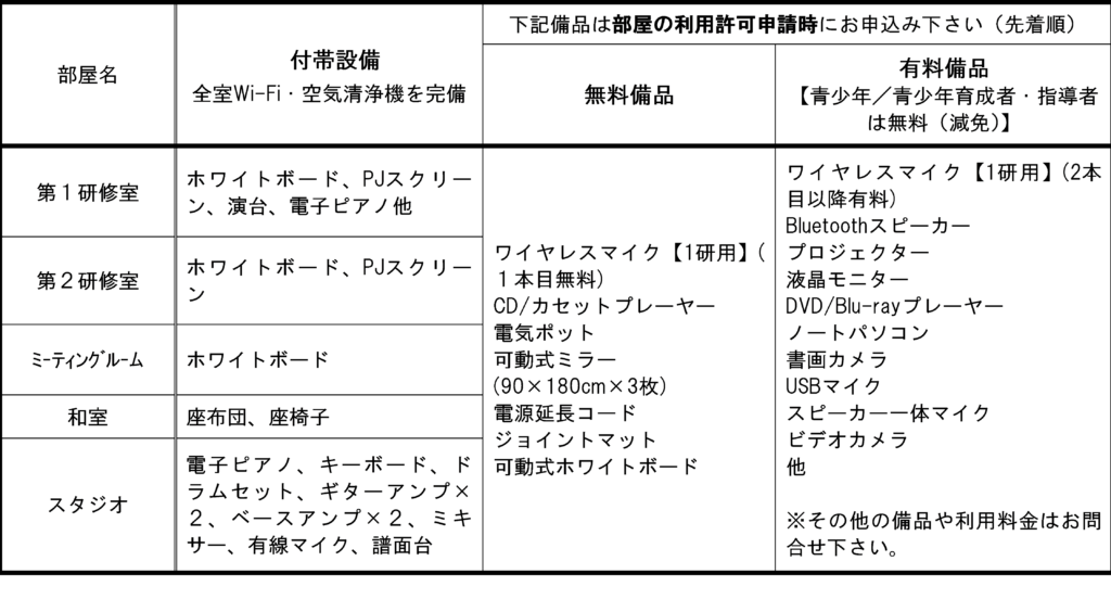研修室等で使用できる備品について (2025年1月更新)