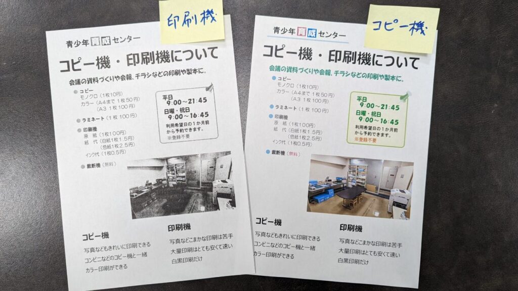 - 印刷機:版下1枚100円、インク代1枚0.5円紙代(白紙)1.5円、(色紙)2.5円