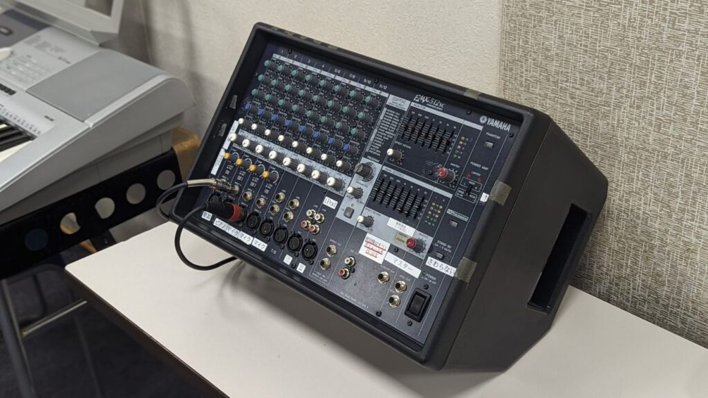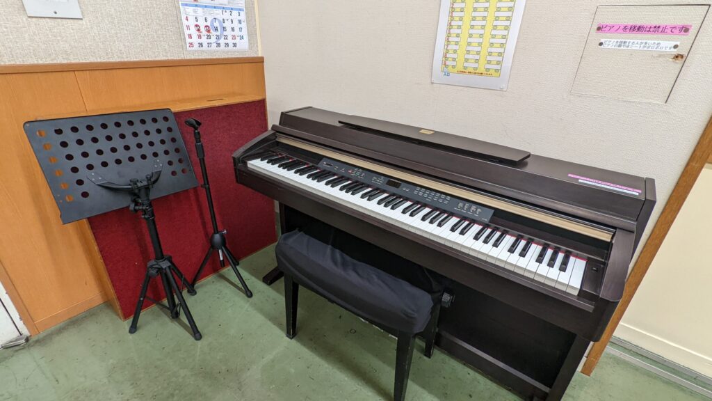 | 付帯設備 | 電子ピアノ 【YAMAHA クラビノーバ SCLP430B】、ドラムセット、ギターアンプ 【Fender Champion 100】 ×2台、ベースアンプ 【Fender Rumble 150】 ×2台、シンセサイザー(キーボード) 【YAMAHA DX7】、ミキサー 【YAMAHA EMX512SC】、有線マイク、譜面台 |