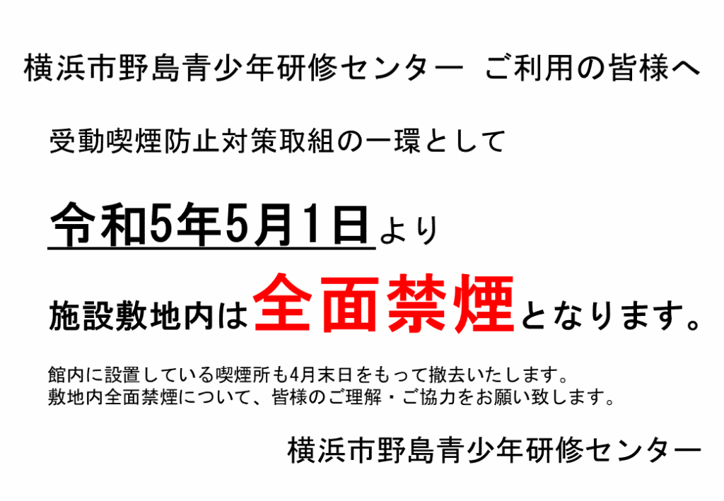 受動喫煙防止対策取組の一環として、2023年5月1日(月)以降は、施設敷地内は全面禁煙となります。