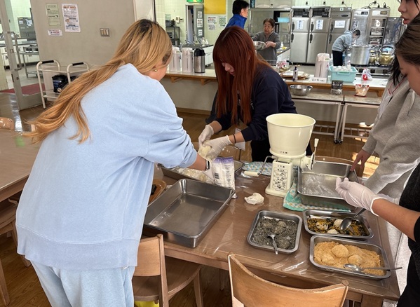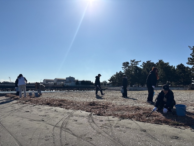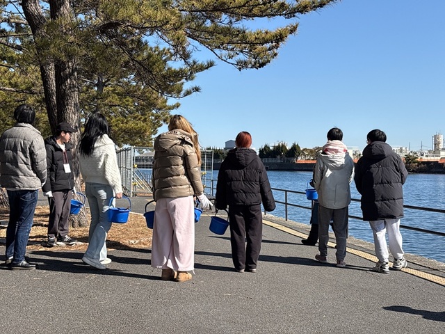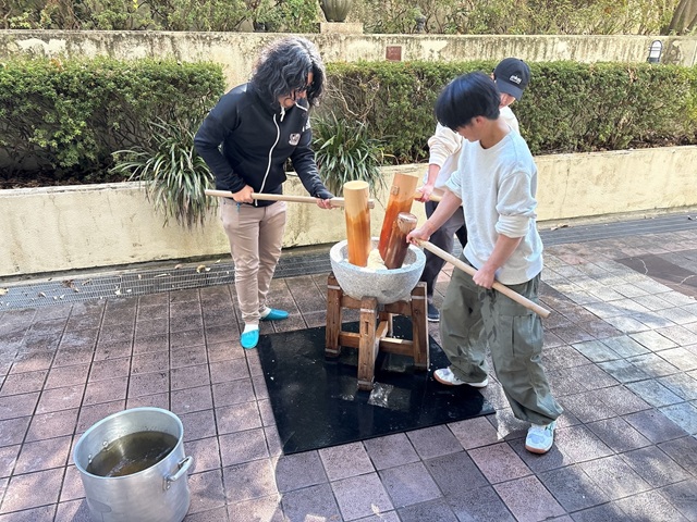 2日目は、プラスチックごみを拾う海岸清掃を体験したほか、公園の自然環境を活かし、昨日からの活動を振り返るとともに、集団で動くことから自分のペースを取り戻してリフレッシュできるよう、朝の陽だまりで寝転んだり、樹にもたれかかって水辺を眺めたり、波の音を聴きながら海を眺めるなど、思い思いに一人で静かに過ごす時間を設けました。昼食は餅つき体験を全員で行いました。午後は横浜市社会福祉協議会から講師をお招きし、ボランティアセンターや横浜市内のボランティアの動向などのお話を伺い、自分たちの活動について改めて振り返り、1日目のグループディスカッションを踏まえた活動上の迷いを講師にも共有、相談することができました。