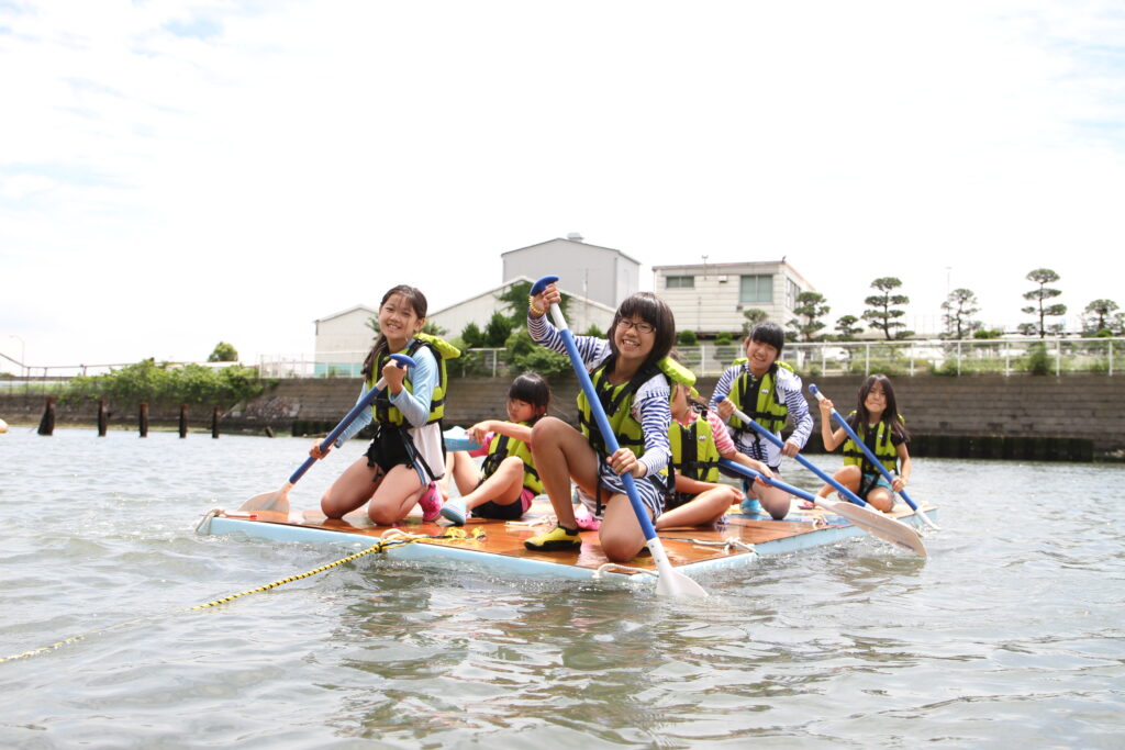みんなでつくる手作りいかだ体験!グループごとに手作りいかだを製作し、野島の海へ漕ぎ出します。全員が協力して組み立てや操船を行う必要があるため、活動にはチームワークが欠かせません。