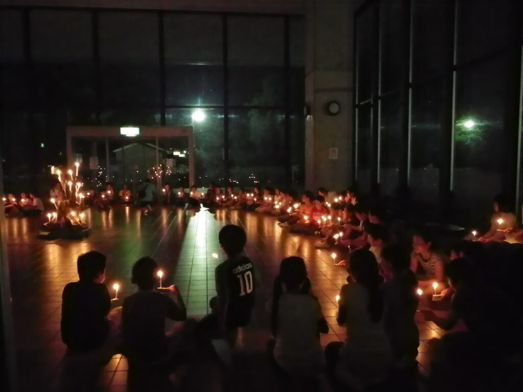 17時以降は正面入口のビジターホールがキャンドルファイヤー場に早変わりします。暗闇のなかでろうそくの火を見つめ、仲間との交流を楽しみましょう。
