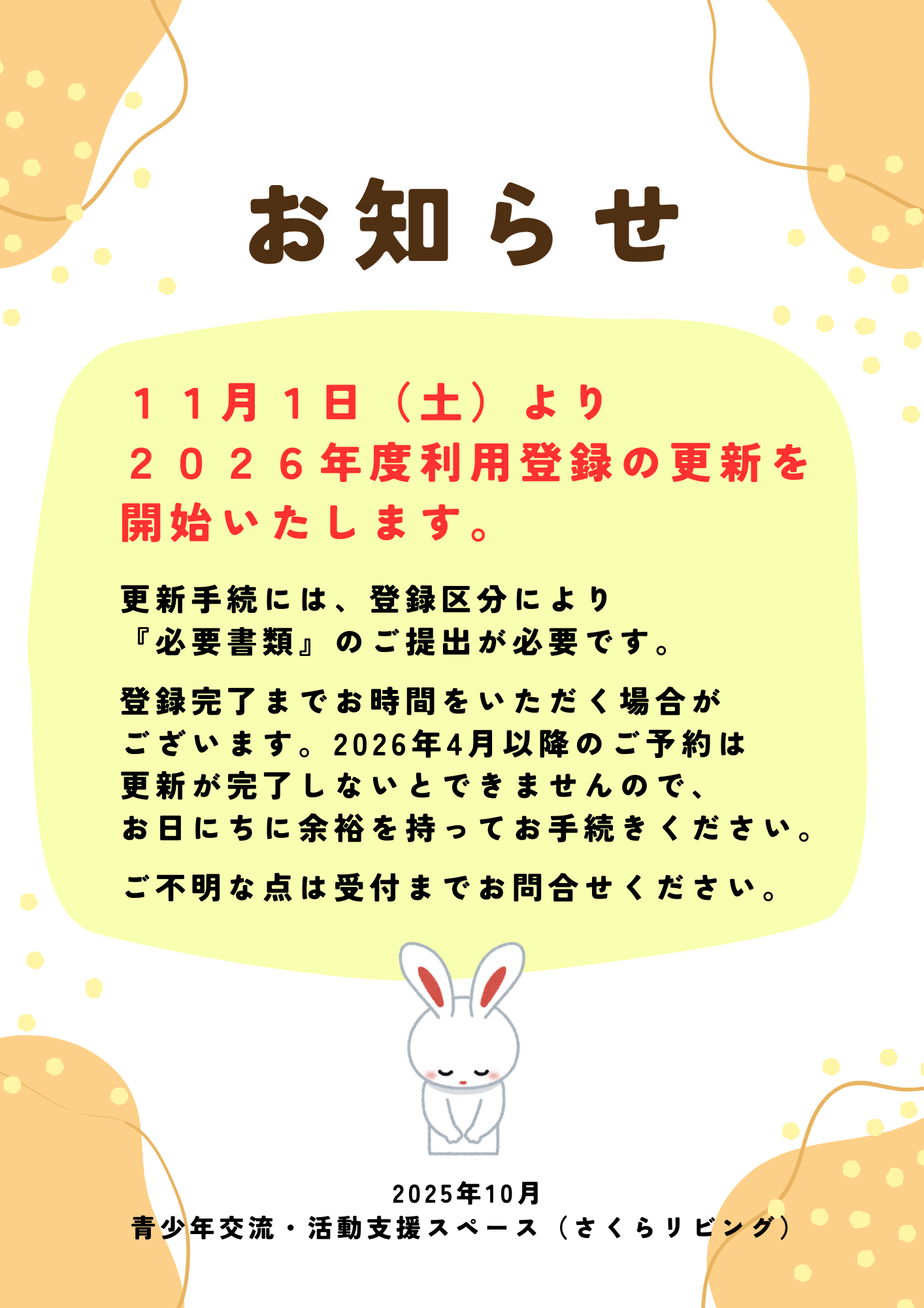 2026年度の利用登録更新手続きが11月1日から始まりました。